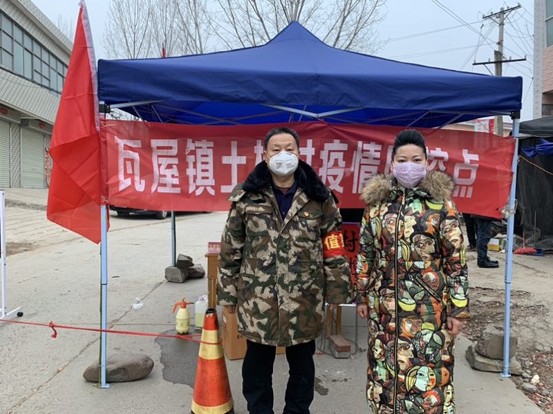 村干部李年生和 妇联主任陈晓燕在村口执勤
