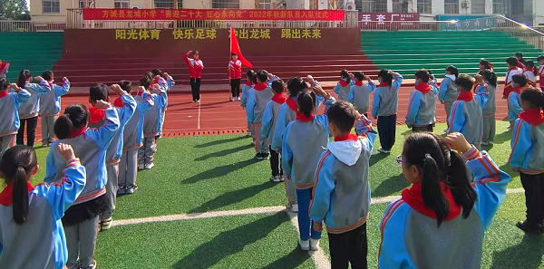 2022年10月14日上午,方城县龙城小学少先队大队部为一二年级同学们,举行了一场以“喜迎二十大 红心永向党”为主题的新队员入队仪式。