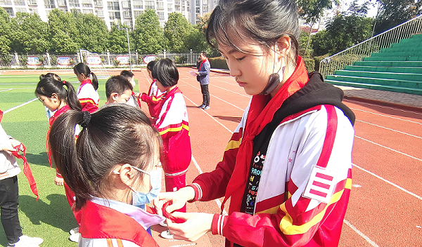 宣布之后,老队员们为新队员佩戴了鲜艳的红领巾,此刻在鲜艳的队旗下,全体少先队员们庄严宣誓:“时刻准备着”,表明为共产主义事业贡献力量的决心。鲜艳的红领巾映衬着新队员的张张笑脸。让我们真诚地祝愿小队员们能怀着一颗火热的心,认真学习,不畏艰难,争做优秀的好队员。