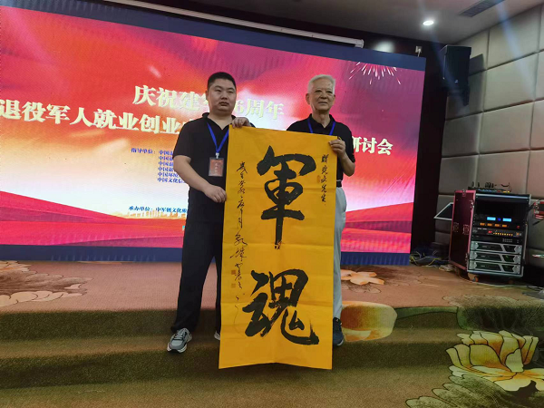 2023年7月29日参加“庆祝建军96周年暨退役军人就业创业中华行军旅科技项目研讨会”,荣获中军创书画院院长田如晨院长赠字“军魂”!